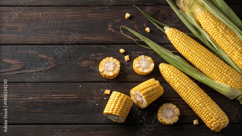 Raw sweet corn on rustic wooden table. Top view of fresh yellow corn cobs and slices on dark wooden background, ideal for recipes, food blogs, or organic produce