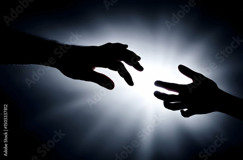 hand, reaching, silhouette, light, background, dark, monochrome, finger, arm, body part, human, abstract, conceptual, contrast, shadow, shape, minimalist, studio, illuminated, glowing, connection, interaction, support, help, hope, despair, mystery, drama, emotion, feeling, human relationships, touching, togetherness, communication, sharing, reaching out, assistance, rescue, comfort, monochromatic, black-and-white, negative space, two people, partnership, greyscale, high contrast, beam of light