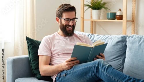 Reading enjoyment at home man engaged with book on couch cozy living room setting joyful atmosphere