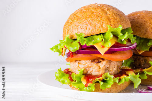 cheeseburger, hamburger, sandwich, american, beef, bread, bun, burger, cheese, cutlet, delicious, fast, fat, food, fresh, grilled, horizontal, junk, ketchup, leaf, lettuce, lunch, meal, meat, onion, plate, salad, sauce, sesame, snack, table, tasty, tomatoes, unhealthy, vegetable, white, wooden