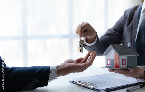 Real estate agent and a client are negotiating a home purchase agreement and deliver the key.