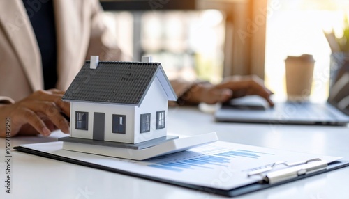 house, real estate, property, agent, document, business, finance, contract, mortgage, home, building, sale, purchase, market, investment, broker, client, office, desk, laptop, computer, chart, graph, datum, analysis, planning, strategy, workspace, professional, career, work, model, miniature, white, grey, table, paper, deal, review, signing