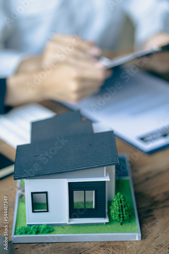 Real estate agents recommend homes and offer insurance interest rate contracts to clients in the home buying idea office.