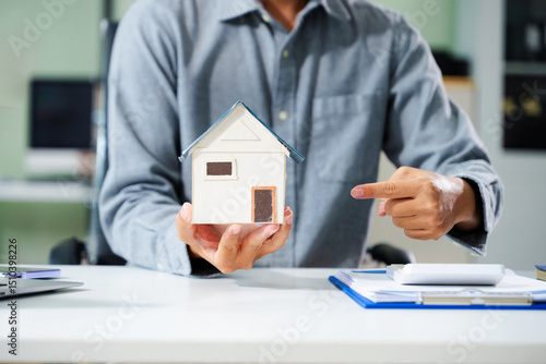 Real estate broker agent presenting and consult to customer to decision making sign insurance form agreement, home model, concerning mortgage loan offer