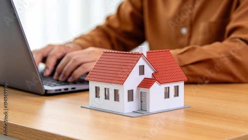 Real estate investment concept with model house and person working on laptop,mortgage,property management and home loan planning for residential purchase