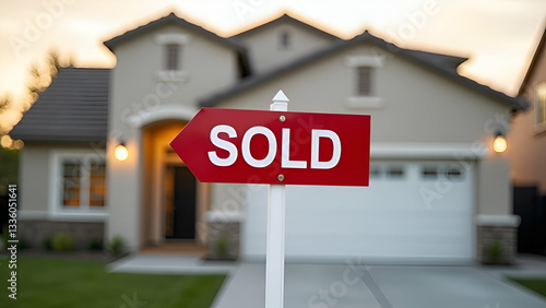 Real estate, suburban house, white exterior, garage, dusk lighting, sold sign, red sign, blurred background, residential property, front yard, home sale, curb appeal, American neighborhood,