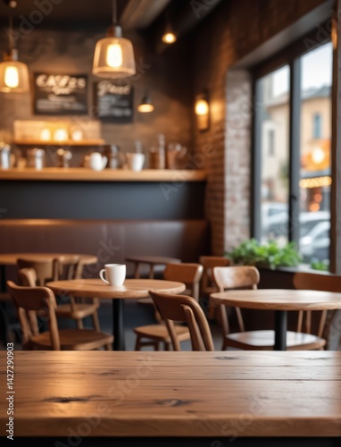 realistic cafe table background. Interior table for a cosmetic item against the blurred and out of focus backdrop of cafe.