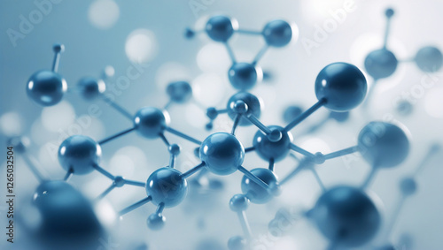 Realistic 3D Scientific Illustration of Molecules – Metallic Blue Atoms on Light Blue Bokeh Background