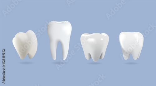 Realistic 3D vector illustration of four human teeth types on blue background. Healthy tooth anatomy concept for dental care, hygiene, and medical purposes