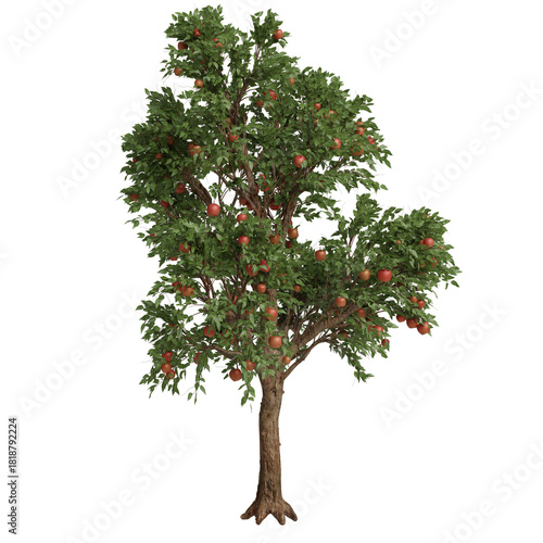 Realistic apple tree with abundant red apples ready for harvest, showcasing vibrant green leaves and a sturdy trunk