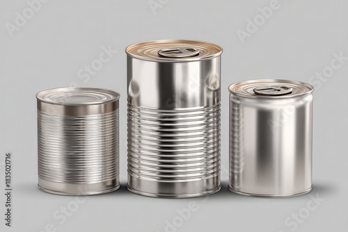 Realistic arrangement of metal cans in various sizes with a transparent background showcasing modern packaging design principles