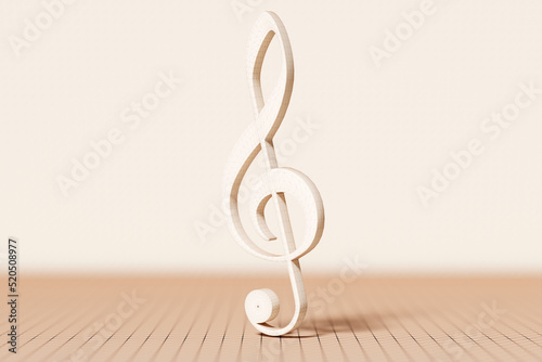 Realistic beige metal treble clef on a monochrome background. 3d golden musical symbol - decoration elements for design.