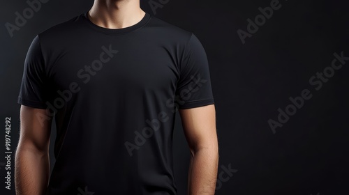 Realistic black t-shirt on young man, blank space for promotional advertisement placed. Empty business concept. The generation of AI