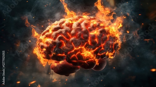 Realistic depiction of a brain burning with orange and red flames, with dark smoke rising, symbolizing overwhelming stress and anger