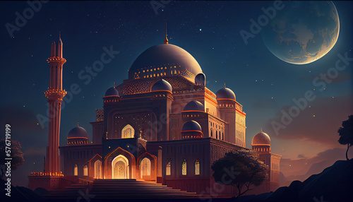 Realistic eid al-fitr mosque illustration background. Generative AI.