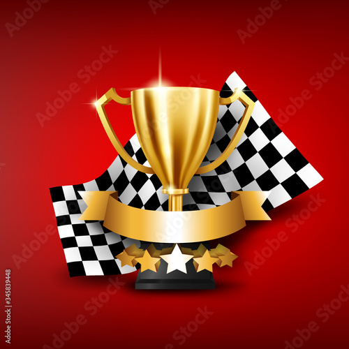 Realistic Golden Trophy with Checkered flag racing championship and place for text
