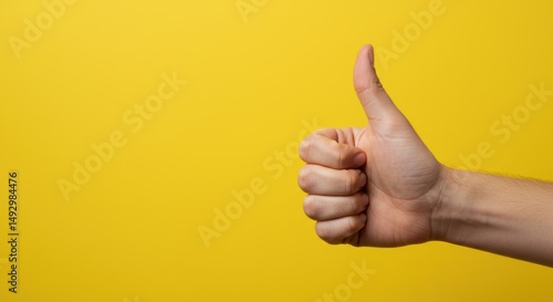 Realistic human hand showing clenched fist with thumb over, light plain background, copy space right. Photorealistic visual concept