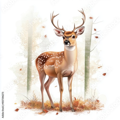 Realistic illustration of a deer in a serene forest setting with autumn leaves.