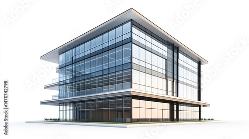 Realistic image of a tall corporate office building, geometric glass panels gleaming softly, isolated on a white background; eye-level shot, vivid clarity, contemporary design.