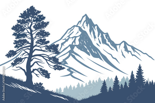 Realistic Mountain Landscape Illustration. Detailed Mountains with Sky Vector Art. Natural Mountain Range Scenic Drawing. Mountain Peaks Realistic Outdoor Design. High Quality Mountain View Vector Art