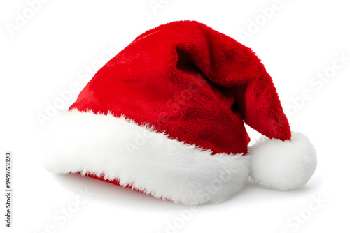 Realistic photo of a red Christmas Santa Claus hat with a white pompom, isolated on white background