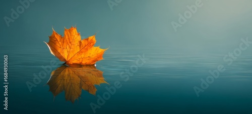 Realistic photo of single autumn maple leaf floating on calm water with perfect reflection, warm sunlight, minimalistic background, peaceful serene mood, clean space for text