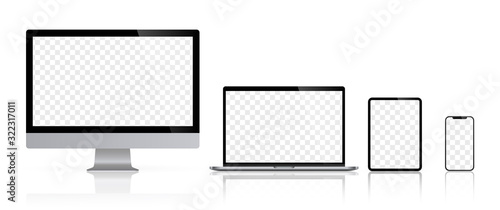 Realistic set of computer monitors desktop laptop tablet and phone reflect with checkerboard screen and white background v3. Isolated illustration vector illustrator Ai EPS