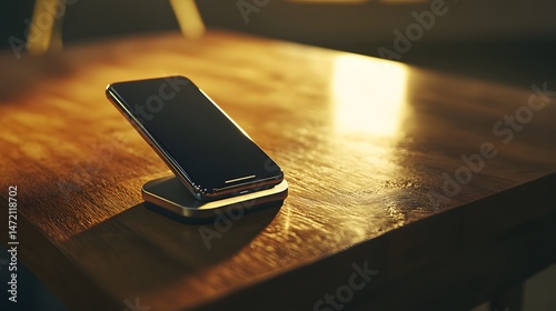 Realistic Wireless Charging Stand Scene With Smartphone On Wood Table