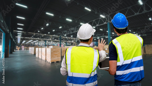 Rear view group of worker standing and checking large retail warehouse logistics, distribution center with computer. Multiethnic business manager looking in future with warehouse building.