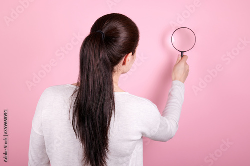 Rear view of a brunette girl using magnifying lens.