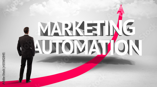 Rear view of a businessman standing in front of MARKETING AUTOMATION inscription, successful business concept