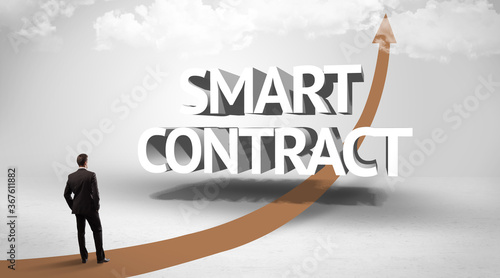 Rear view of a businessman standing in front of SMART CONTRACT inscription, successful business concept