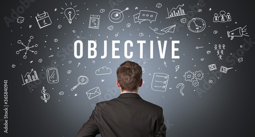Rear view of a businessman with OBJECTIVE inscription, modern business concept