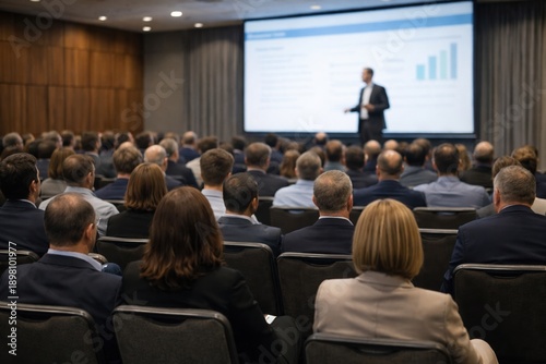 Rear view of a professional conference hall with a large audience attending a business presentation, visible presentation content on screen, modern corporate training or seminar environment.
