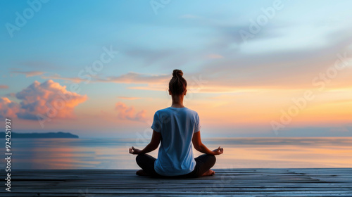 Rear view of a woman meditating on a wooden dock by the ocean at sunrise, embracing tranquility and inner peace.