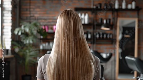 Rear view of a woman with long blonde hair in a hair salon