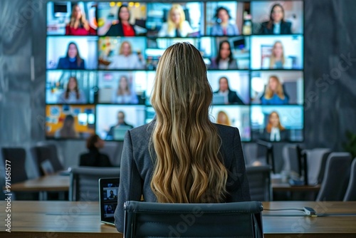 Rear view of businesswoman having a video conference in her office, showcasing modern work practices and technology in a professional setting.