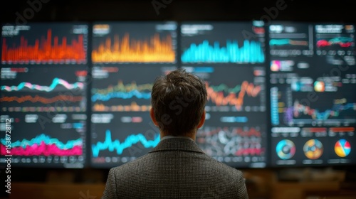 Rear view of man in suit analyzing multiple financial data charts and graphs on large digital screens perfect for finance presentations, stock market videos and investment visuals