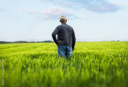 farmer, senior, standing, barley, field, backview, examining, crop, wheat, working, agriculture, men at work, inspection, farming, rancher, farm, rural, man, nature, background, spring, agricultural, countryside, summer, outdoors, cultivated, male, plant, green