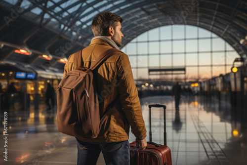 Rear view of young business man carrying a suitcase in the airport Male businessman traveling by plane