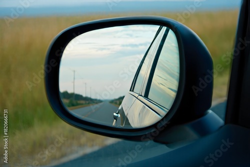 Rearview Mirror Reflection of Rural Road and Field