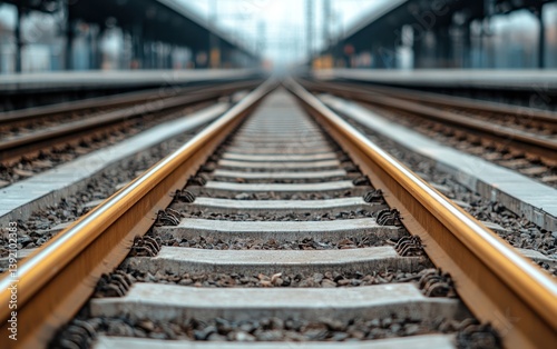 train, track, railway, railroad, transportation, travel, journey, perspective, receding, line, distance, metal, steel, concrete, ground, texture, grey, brown, cloudy, day, path, way, route, direction, horizon, depth, sharpened, blur, background, atmosphere, serene, contemplative, calm, peaceful, motion, movement, speed, adventure, exploration, escape, freedom, rail, line, system, infrastructure, linear, converging, geometric