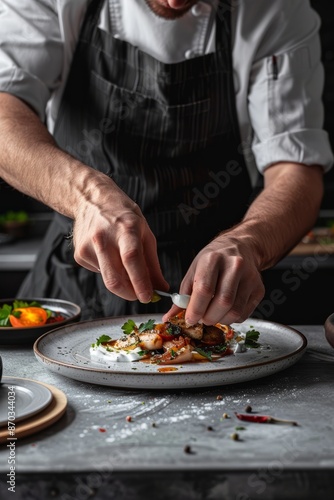Recipe Developer Garnishing Dish, adding final touches before serving, Generative AI