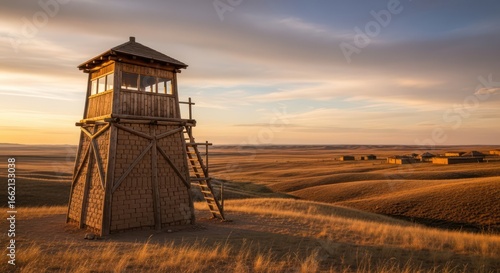 montana, sunset, historic, history, landmark, architecture, building, tower, watchtower, wooden, structure, plain, prairie, landscape, american west, frontier, tour tourism, travel, outdoors, sky, cloud, grass, golden hour, reconstruction, heritage, culture, historical building, site, rural, scenic, view, traditional, preservation, vintage, old, retro, outpost, military, fort, western, travel destination, summer, day, nobody, national park, historical site, architectural