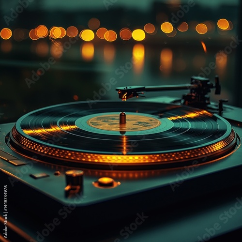 vinyl, record, player, turntable, music, sound, audio, night, city, light, evening, bokeh, urban, jazz, classical, pop, rock, electronic, dj, spinning, listening, analog, retro, vintage, music lover, groove, dance, party, nightlife, entertainment, acoustic, audiophile, audio system, warm, gold, light, night view, river, bridge, urban scene, relaxing, beautiful, quality, music festival, soundboard