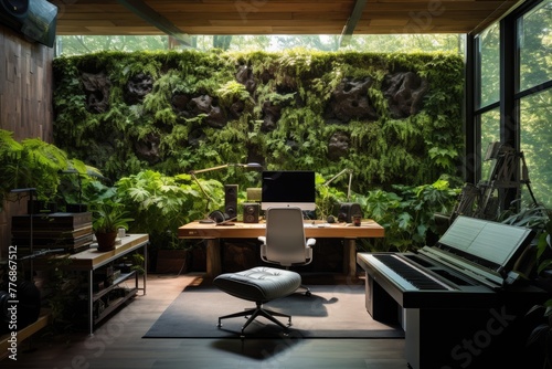Recording studio, A recording studio with a living green wall for a nature touch, AI generated