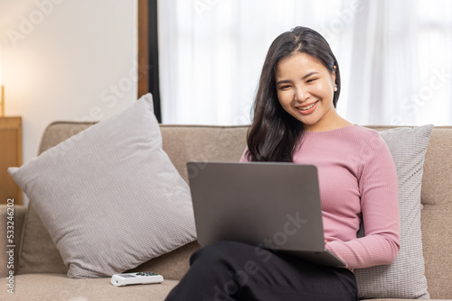 Recruitment Concept. Girl Browsing Work Opportunities Online on sofa at home, Happy Asian woman Using Job Search App or Website on Laptop, Copy Space