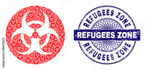 Recursive composition bio-hazard and Refugees Zone round rubber stamp seal. Blue stamp seal includes Refugees Zone title inside circle and guilloche structure.