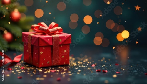 Red & gold gift box, glitter splash, festive ribbons Holiday background , shimmer, box