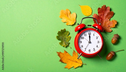 clock, alarm, analog, red, time, watch, hours, minute, hand, face, acorn, leaf, maple, oak, autumn, fall, season, green, background, vibrant, colourful, decoration, design, display, arrangement, concept, transition, change, reminder, punctuality, schedule, countdown, ticking, vintage, classic, retro, lifestyle, seasonal, harvest, foliage, nature, contrast, striking, cosy, warm